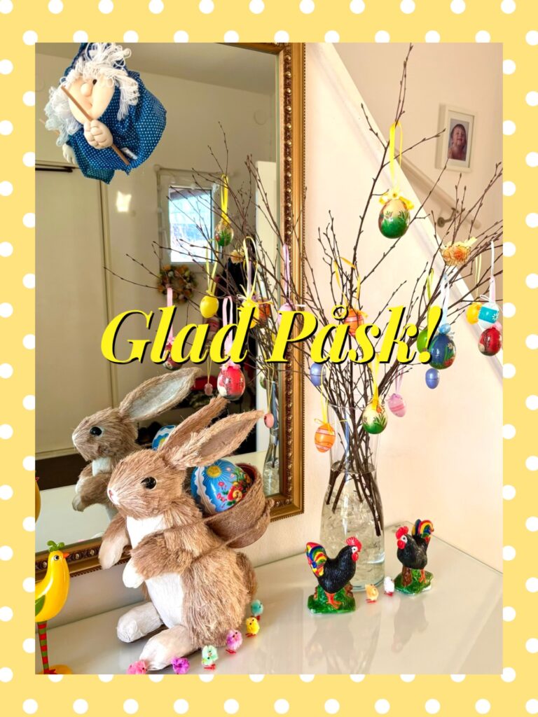 Påskpyntet får hålla sig i hallen. Där blev det ris, kycklingar, tuppar, höns, ägg (hela hönsgården alltså) och en hare. Och ett par påskkärringar såklart.